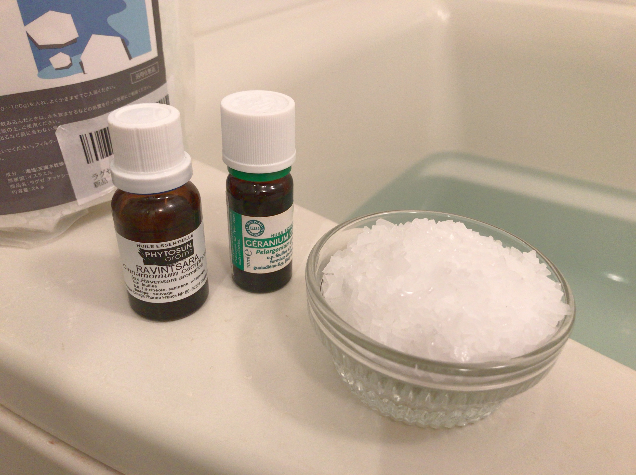 私がよく使うのは「ラベンサラ」と「ゼラニウム」のエッセンシャルオイル。こちらを死海の塩に数滴垂らして混ぜてからお風呂に入れています。